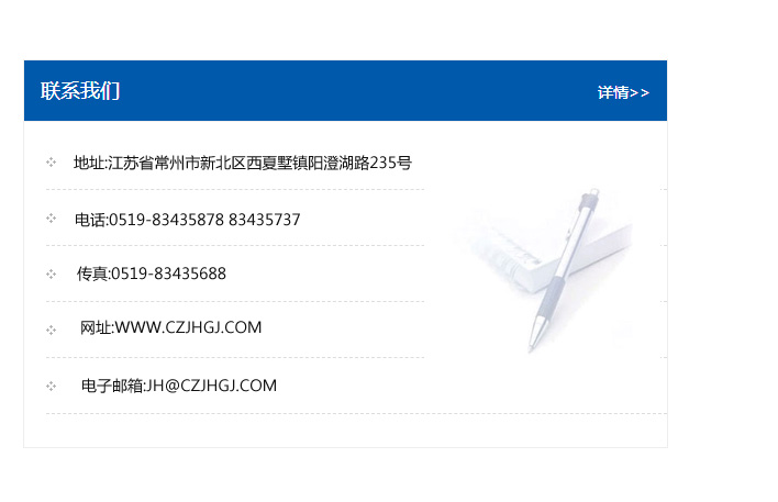 地址:常州市新北區(qū)友邦商務(wù)大廈1幢16、17層  電話:0519-85101652  傳真:0519-85112595  郵編:213022  網(wǎng)址:www.cz-jiayue_cn.bjwdhy.com  郵箱:xiajifengaa@163.com